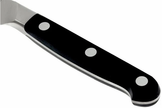 The kitchen knives from the Pro collection are enhanced with a blade that is forged from one piece of steel. The full tang blade seamlessly merges with the plastic handle. The handle is secured to the steel with three rivets. The transition between the handle and steel is seamless. No dirt can accumulate in between. These knives are enhanced with a classic design and appeal to those who prefer heavier knives.